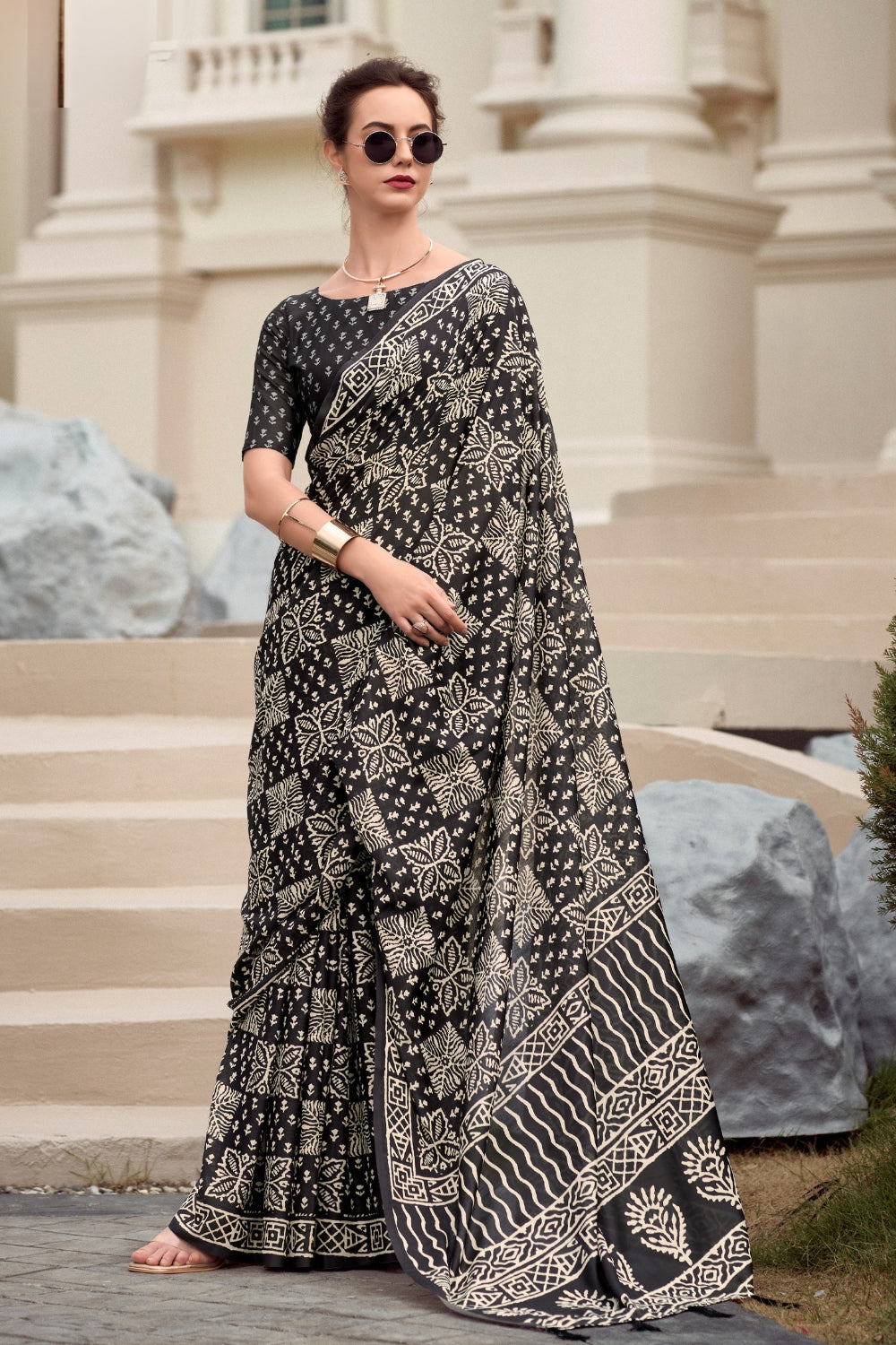 Coal Black Pure Mal Mal Silk Saree